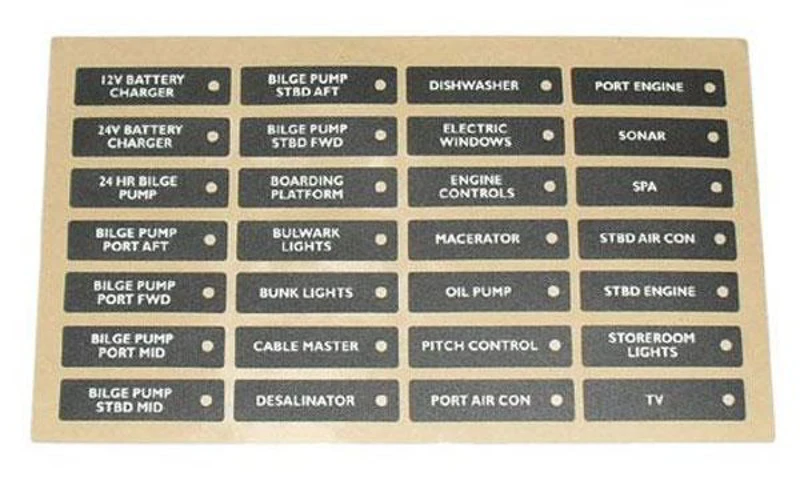 hard-wearing labels: 12V Battery Charger, 24hr Bilge Pump, 24V